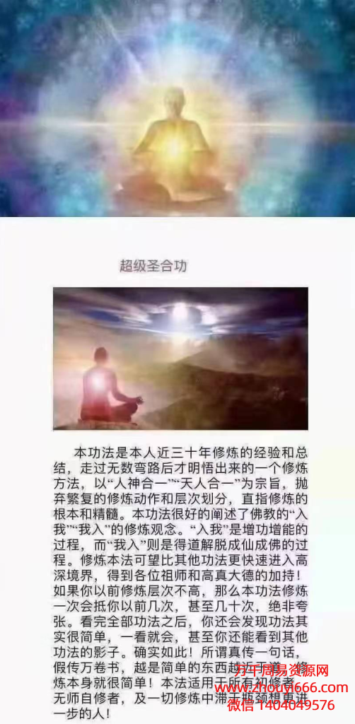 (本功法是老师近三十年修练的经验和总结,走过无数弯路后才明悟出来的一个修炼方法,很好的阐述了佛家的“入我,我入”的修练观念!入我是增功增能的过程,我入则是成佛的过功。购买了本功法后,你会发现功法其很简单,一看就会。确实如此!所谓真传一句话,价值万卷书。越是简单的东西越接近于道,修炼本身就很简单!此法适用于所有初修者,及修上想更进一步的人!