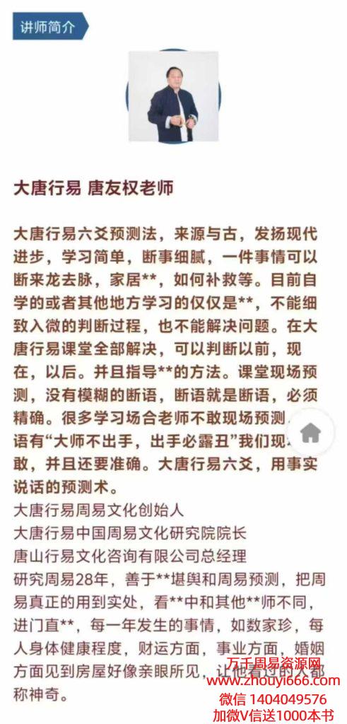 九,如何婚断姻,断财运,断事业,断失物,断家居等量大案例析分或者现场为学员断,一边断一边的讲方式进行。全部采用真案实例,不弄虚作假。现活场跃。 十,预不测是目的,解决是才根本,大唐易行利用爻六理论,判断出情事来还要决解问题,可以告诉对方住的宅哪里有问题,哪里坏了,如何弥补,这六是爻化解法,还有其他更多的交六化解方法,让迷茫的人找到己自的路。