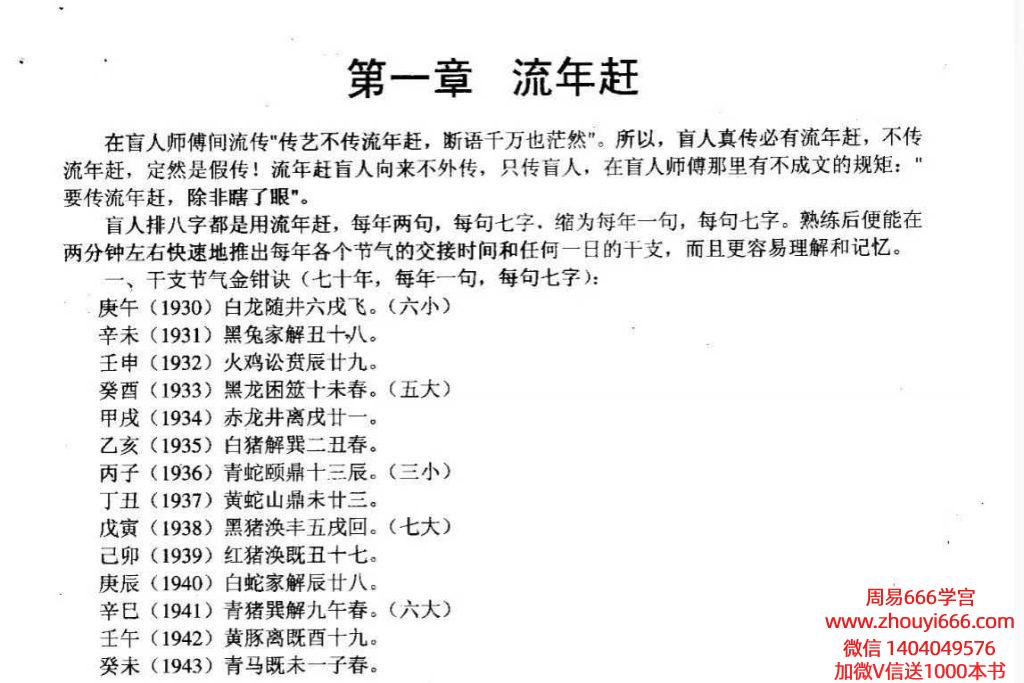 盲人排八字都是用流年赶,每年两句,每句七字,缩为每年一句,每句七字。熟练后便能在两分钟左右快速地推出每年各个节气的交接时间和任何一日的干支,而且更容易理解和记忆。