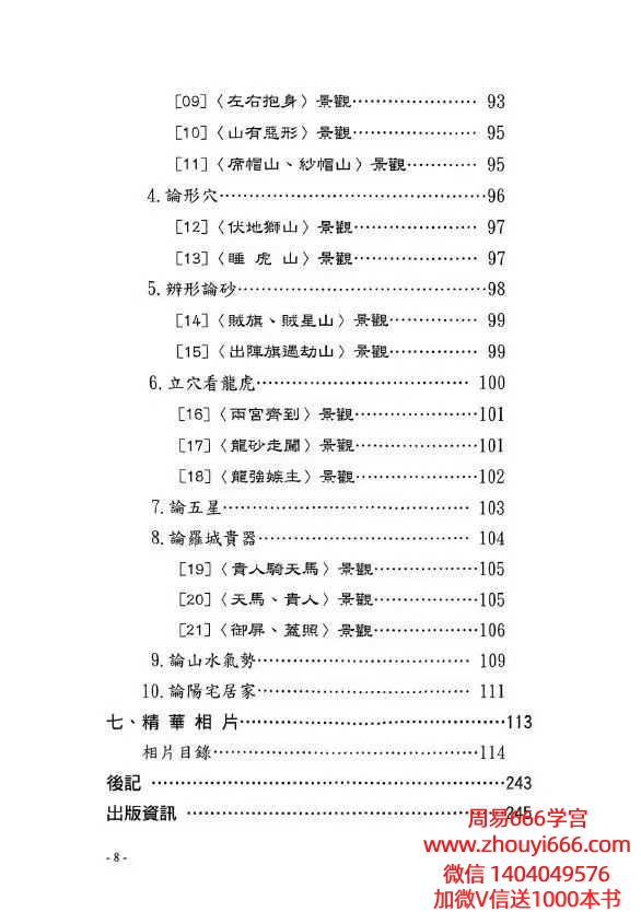 简介:《龙穴砂水精义》丁元黄,堪舆风水相关书籍。堪舆学首重“峦头形势”,其次才是“时运理气”,再其次才是“择日选时”。只是现化人的应用程序,刚好反其道而行。阴阳两宅的吉凶验证,也须就地论理,以推测人事的吉凶。见“机”验断者,乃“占卜、通灵”之术。堪舆典籍经常提到,“峦头无理气不灵。理气无峦头不准。”但是“空间”的环境有“形势”理气;“时间”的气运有“天运”理气;“人事”的运用有“选时”趋避;以上必须了解明辨。古籍的“峦头”形势书籍,皆以大陆“中原”的地理环境作论说。有某些高明的论著又是大而化之,通其“神理”的鸟瞰作品。所以对初学者在应用上彷彿有些困难。察龙点地,首重行龙是否成局并加以判定。若行龙已驻息,则重“点穴、立极”,以致其大用。本书的编排,纯取“龙、穴、砂、水”的学理精华,作重点的提示,以利初学者能轻易入门,了解堪舆玄机。